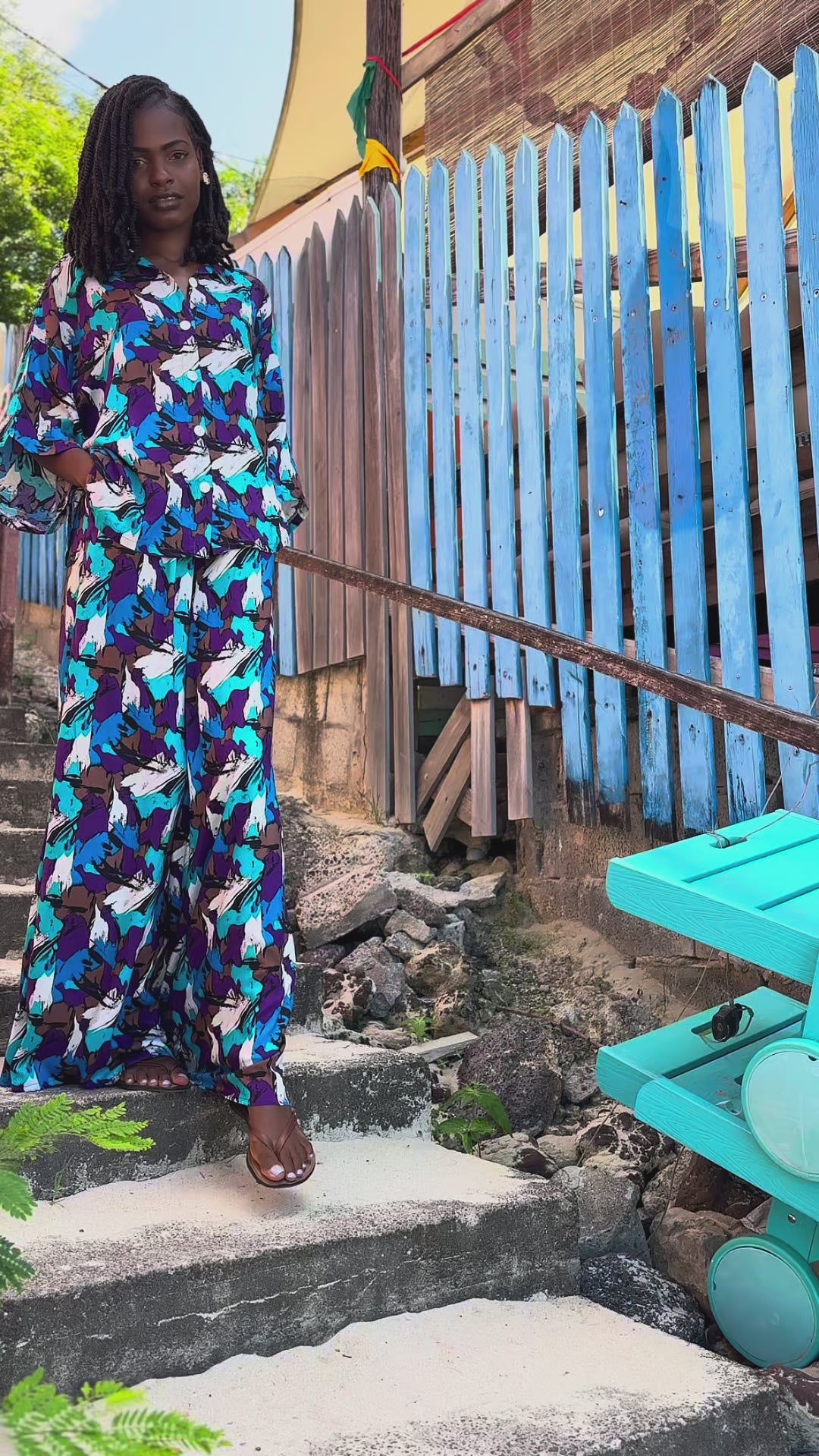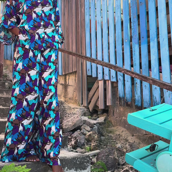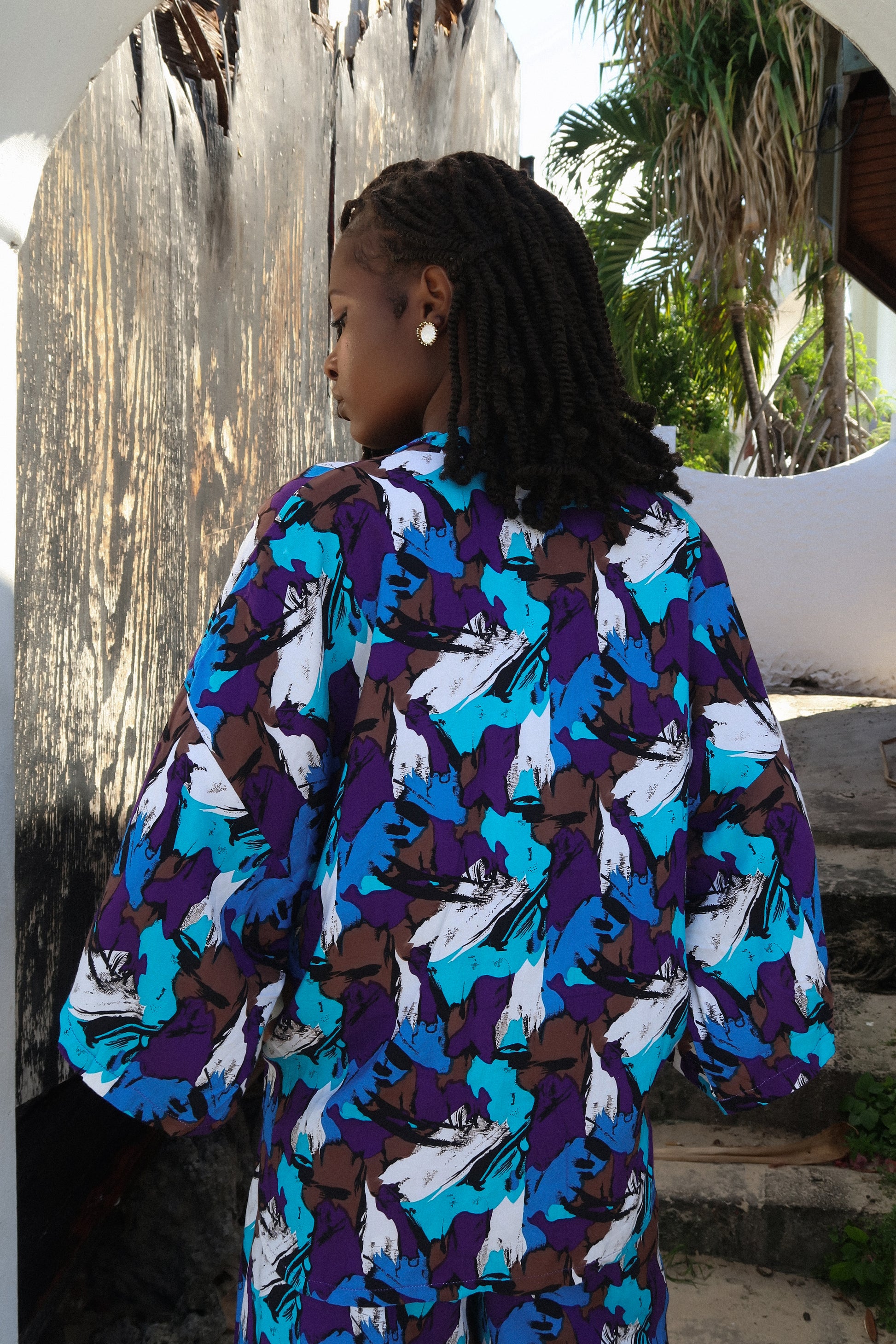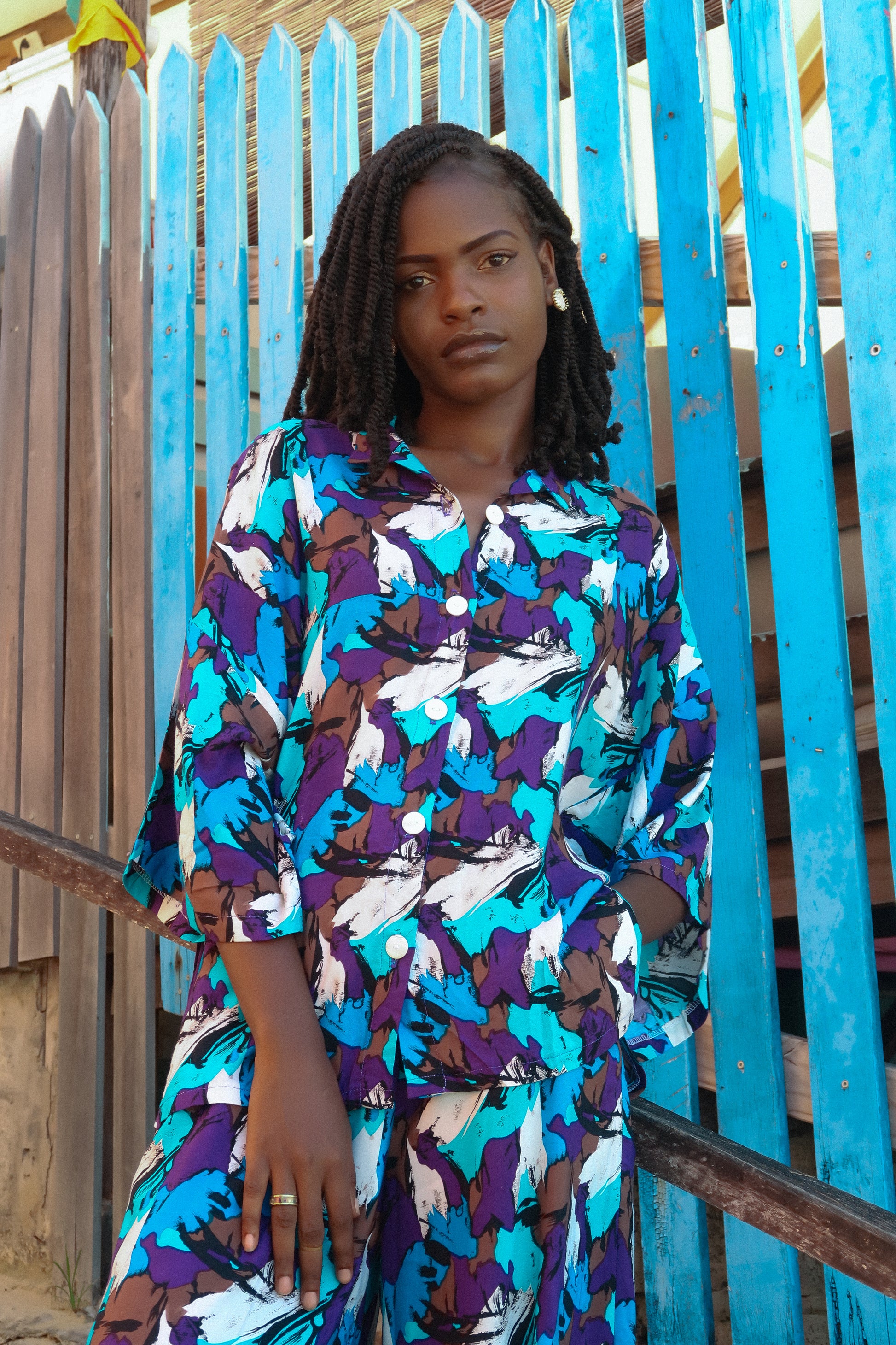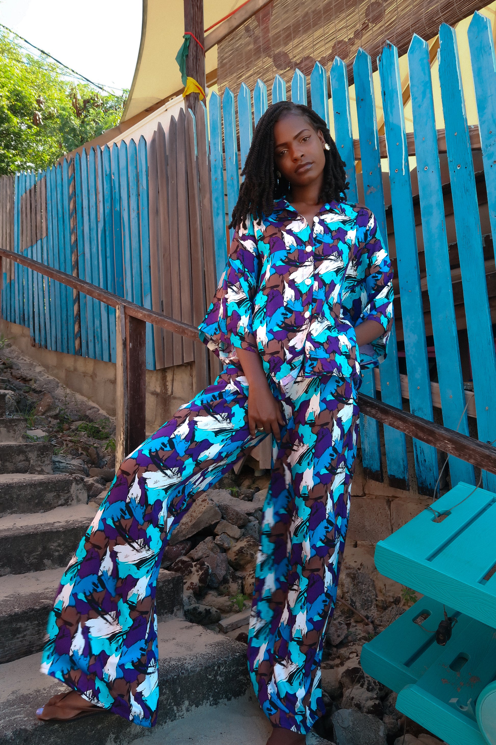 An oversized button-down paired with fluid wide-leg trousers, cut in a breathable linen blend that moves with ease.